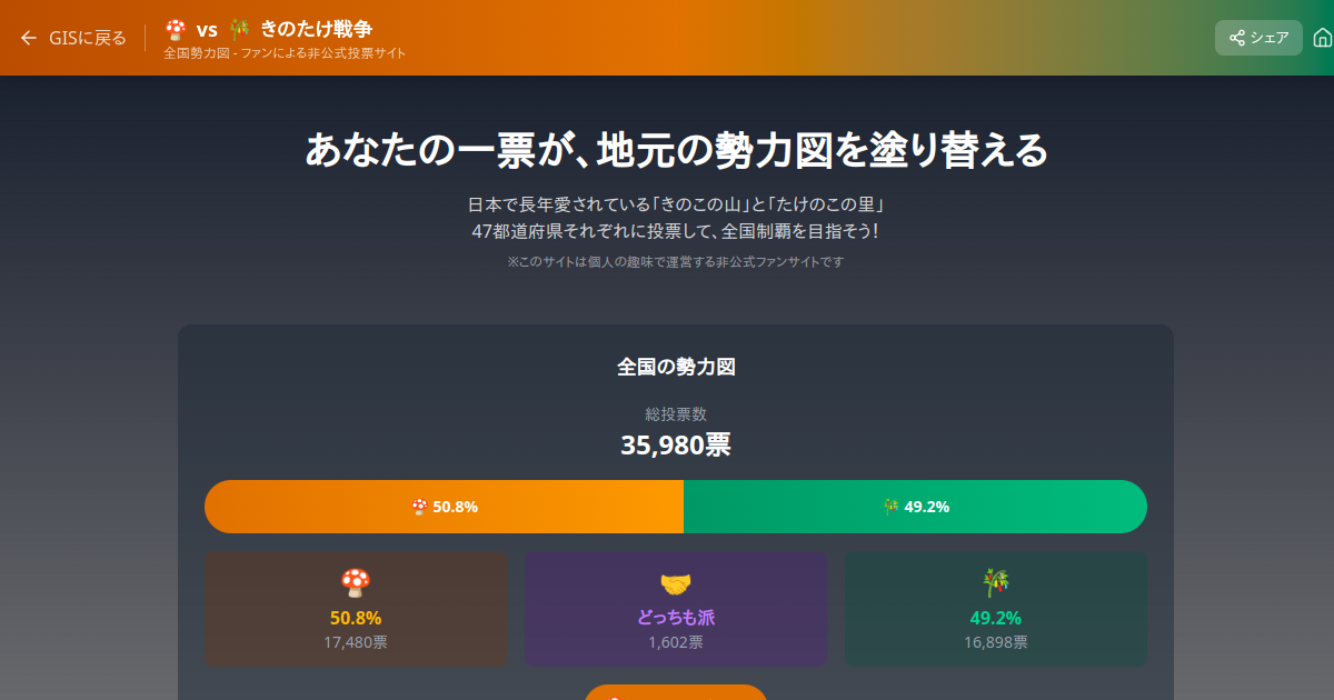 きのこの山 vs たけのこの里。47都道府県の投票結果をリアルタイムで地図に反映。あなたの一票が地元の勢力図を塗り替える!